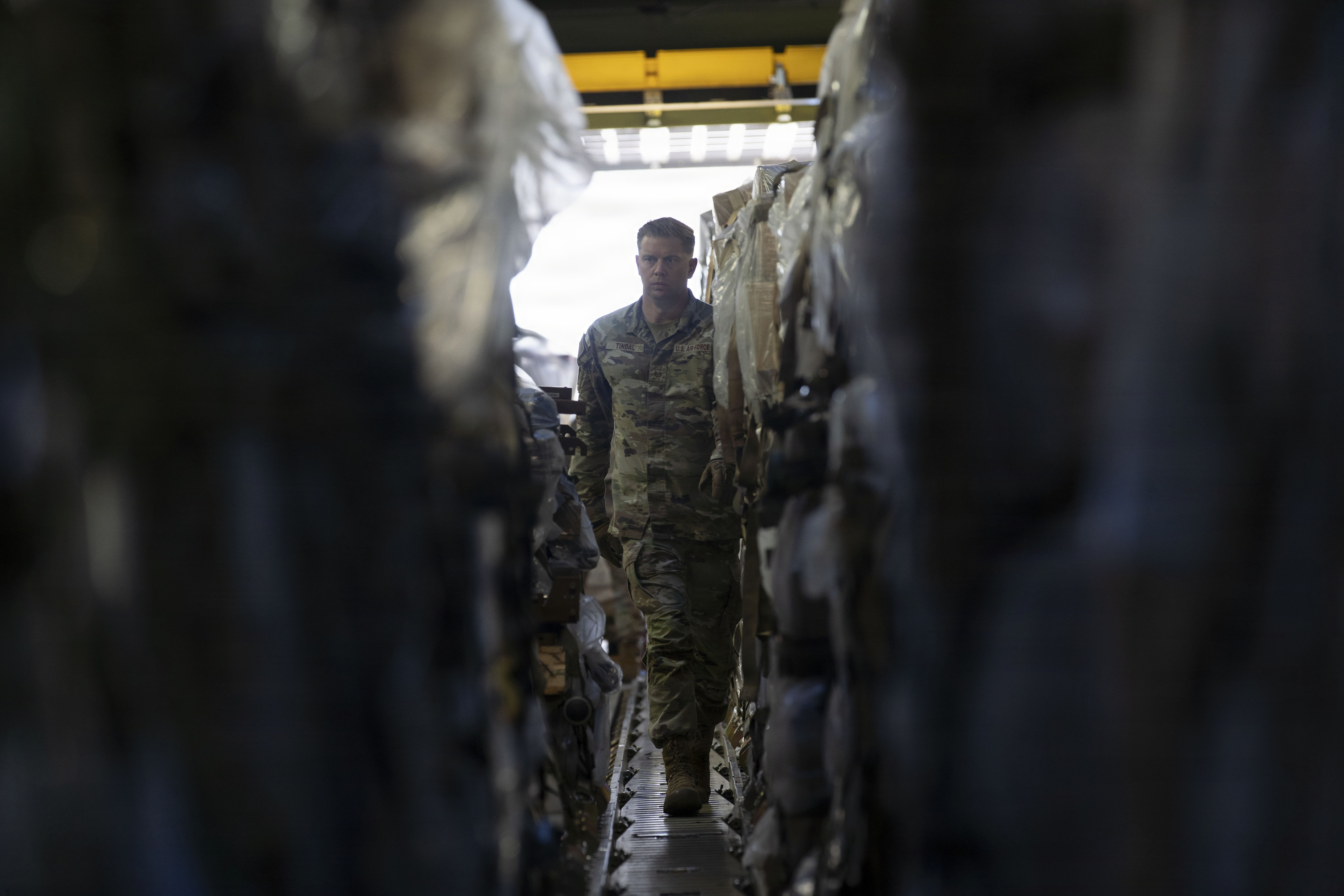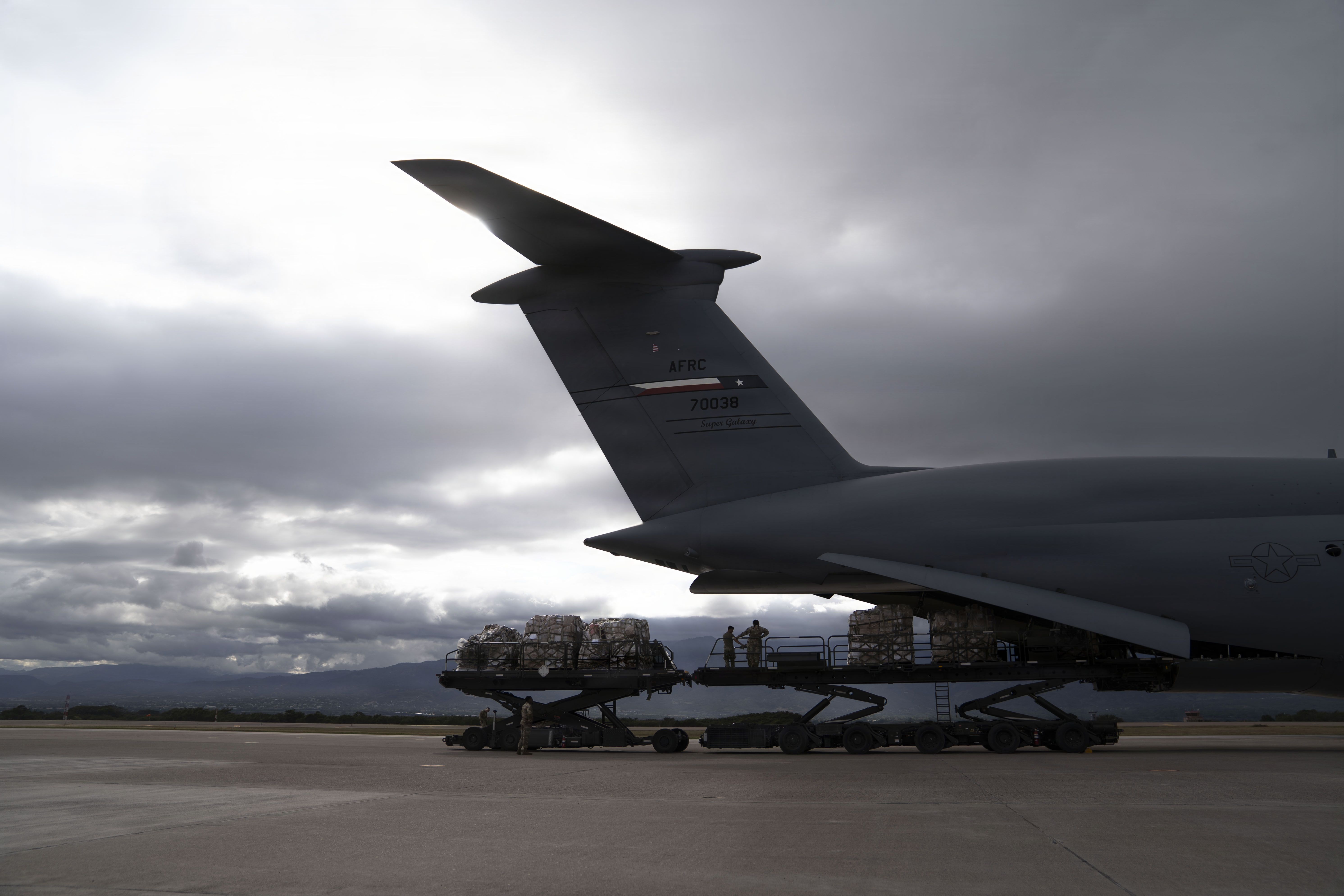 U.S. Air Force Staff Sgt. Bryce Marquardt, center, 612th Air Base Squadron air transportation supervisor, Tech. Sgt. Alexandria Mayfield, left, 612th ABS materiel management section chief, and Staff Sgt. Alina Serrano, 612th ABS noncommissioned officer in charge of materiel management, marshal a K-loader during a Denton mission at Soto Cano Air Base, Honduras, Jan. 12, 2026. Airmen from the 68th Airlift Squadron, Joint Base San Antonio-Lackland, Texas, and Airmen from the 612th ABS offloaded 90,000 pounds of humanitarian cargo off of a C-5M Super Galaxy during a Denton mission. For over 25 years, Joint Task Force-Bravo has been at the center of the Denton Humanitarian Assistance Program in Honduras, which is is a Department of War and Department of State initiative that moves humanitarian cargo donated by non-governmental organizations to various locations around the world. (U.S. Air Force photo by Staff Sgt. Alexander Merchak)