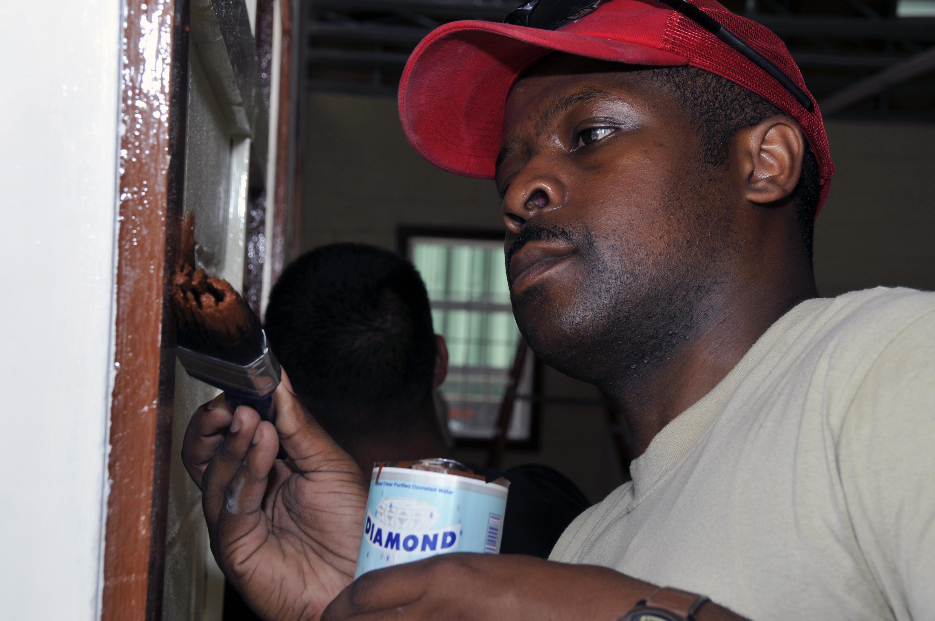 Tech. Sgt. Jerrell Turner, structures craftsman, 555th Red Horse Squadron, Nellis AFB, Nevada, paints a piece of window trim Aug 25, 2009, in Georgetown, Guyana. The 555th RHS is putting the finishing touches on the new school, before the guyanese students return to class. (U.S. Air Force photo by Airman 1st Class Perry Aston) (Released)