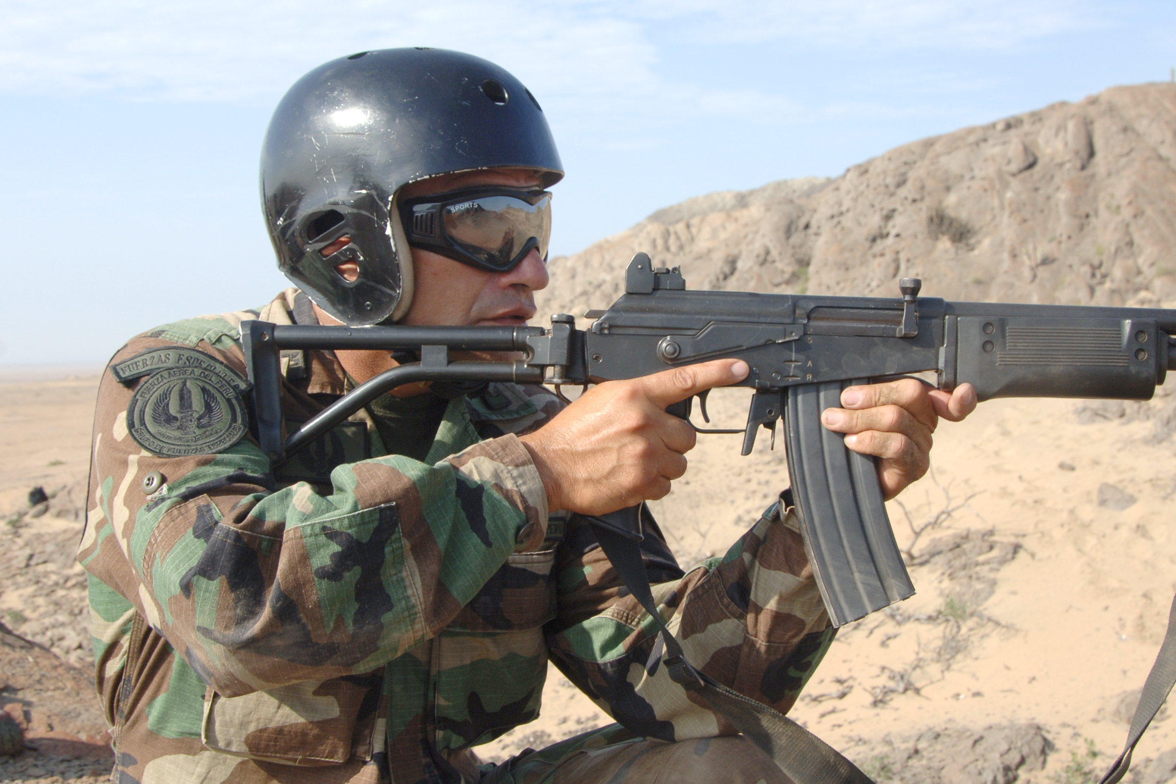 A member of the Peruvian special forces keeps an eye out during a joint combat search and rescue exercise Feb. 14 near Chiclayo, Peru. The exercise was part of Falcon and Condor 2007, a joint exercise between the U.S. and Peruvian Air Forces. (U.S. Air Force photo/Tech. Sgt. Kerry Jackson)