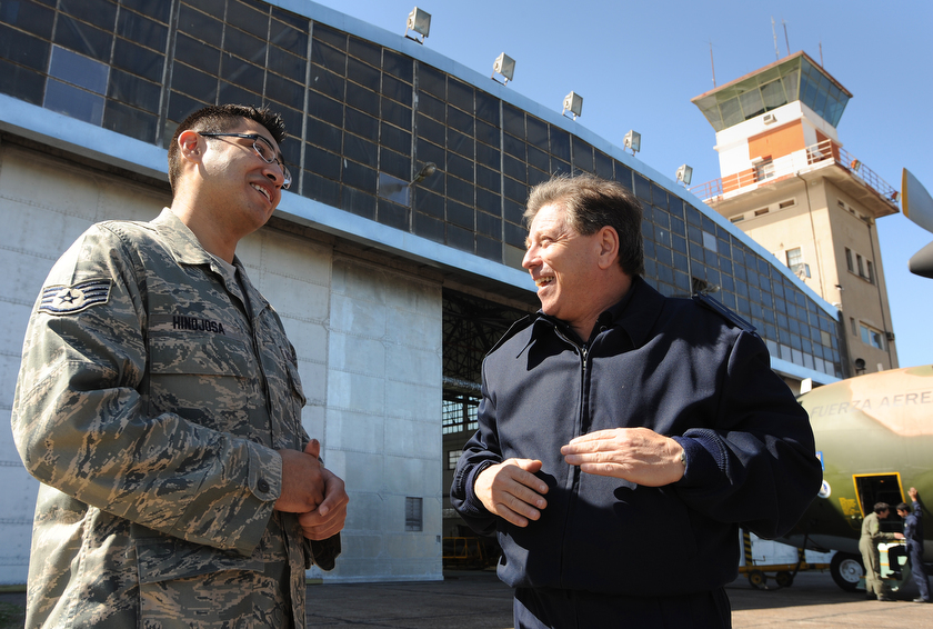 Staff Sgt. David Hinojosa (left) shares stories Oct. 30 with former student (right) Argentinean air force Senior Master Sgt. Jose Minichiello, training superintendent for the 1st Air Brigade, Technical Group D. The exchange between the two countries' Airmen is part of Operation Southern Partner, which brings U.S. Air Force Airmen to South America to have a two-week subject matter exchange emphasizing partnership, cooperation and sharing of information with partner nation Air Forces in Latin America. Sergeant Hinojosa is an aircraft structural maintenance instructor for the Inter-American Air Force Academy at Lackland Air Force Base, Texas. (Air Force photo/Staff Sgt. Bennie J. Davis III)